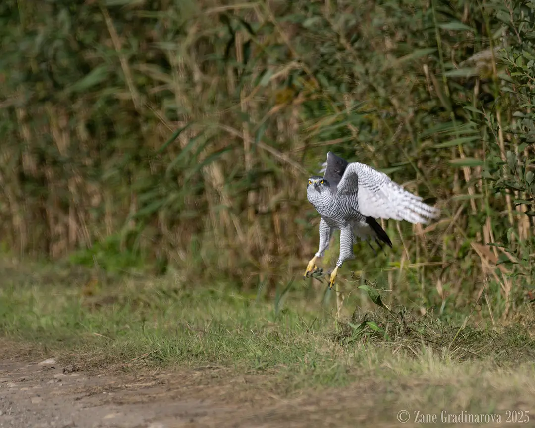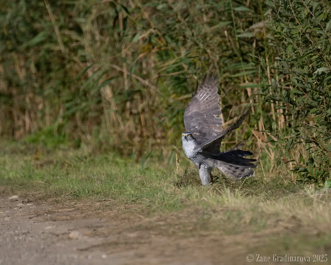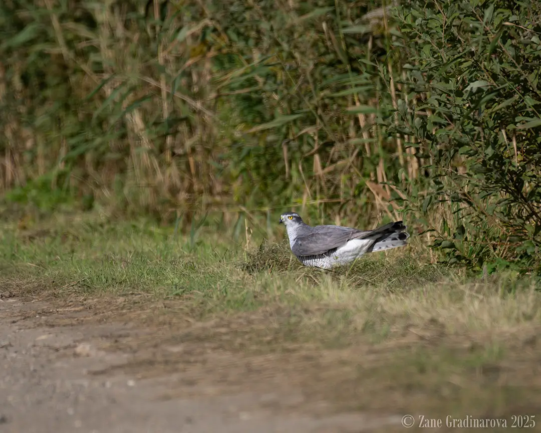 And then came a real surprise — a Goshawk swept silently right over my head from behind and landed on the road about 30 meters away.